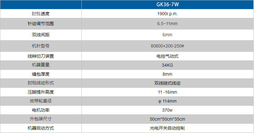 GK36-7W全自動雙針?biāo)木€全自動封包機(jī)采用雙機(jī)針縫合,一次縫兩趟線,牢固可靠,可實現(xiàn)無泄漏封包,適合于對縫口有嚴(yán)格要求的廠家對紙袋、塑編袋、布袋等的封包縫口。采用 光電開關(guān)自動控制啟停機(jī)、電控氣動式切刀自動剪切線辮,適合于自動化程度較高的化工廠、倉庫、碼頭等流水線縫包。